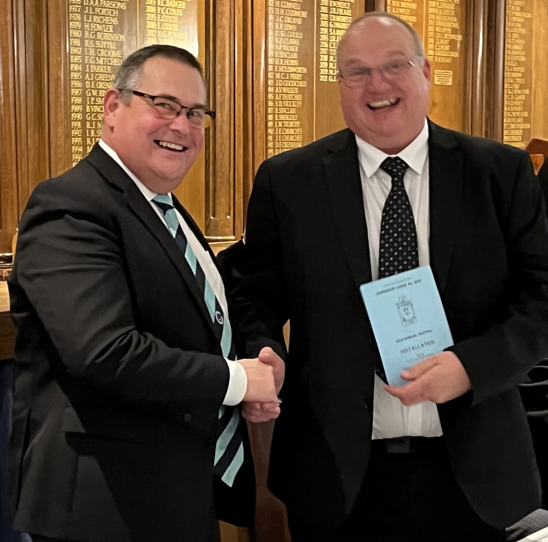 The APGM Gloucestershire WBro Ian Davies with our new WM for 2022/3 at our Installation meeting in November 2022.